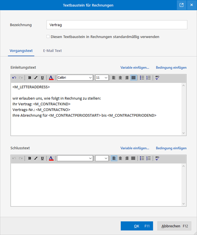 Tragen Sie hier eine eindeutige "Bezeichnung" ein. Da ein Textbaustein im besten Fall auch für Verträge anderer Kunden genutzt werden kann, empfiehlt es sich hier, mit Variablen für die Laufzeit, den Namen des Kunden etc. zu arbeiten, anstatt diese Informationen fest im Text einzugeben. Durch Klick auf "Variable einfügen…" stehen Ihnen dafür einige vorgefertigte Variablen zur Verfügung.