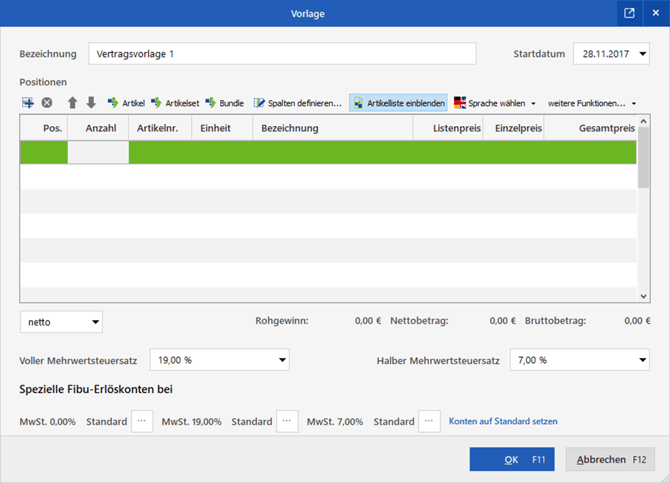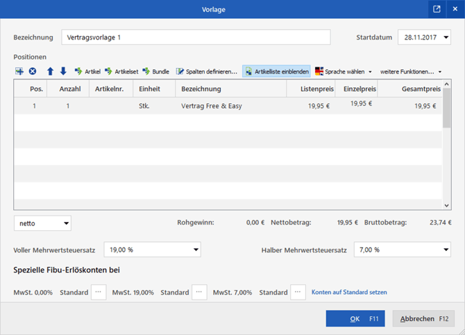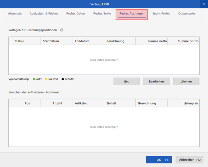 Tragen Sie alle nötigen Artikel ein und bestätigen Sie dies mit Klick auf "OK". Sie landen nun wieder in der Übersicht der Vorlagen für die Rechnungspositionen im Reiter "Rechnungs-Positionen" des Vertrags. Es besteht übrigens auch die Möglichkeit, die Vorlagen noch während der Laufzeit zu bearbeiten.