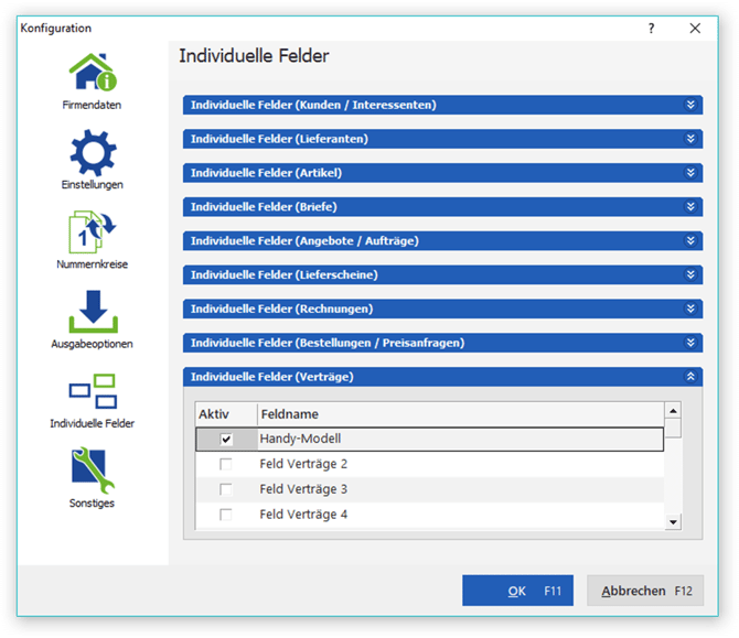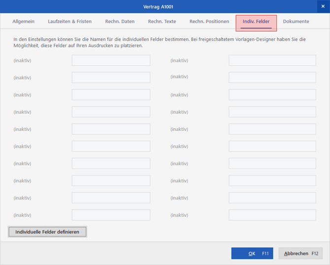 Um ein individuelles Feld zu aktivieren, klicken Sie links unten auf "Individuelle Felder definieren".