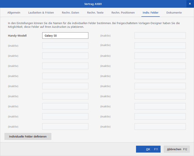 Nicht für alle Informationen gibt es unter WISO MeinBüro Desktop auch das passende Eingabefeld. Deswegen stellt WISO MeinBüro Desktop bis zu 20 individuelle Felder zur freien Verfügung. Diese können im Vertrag mit einem beliebigen Inhalt gefüllt und in der Übersicht der Verträge dargestellt werden.