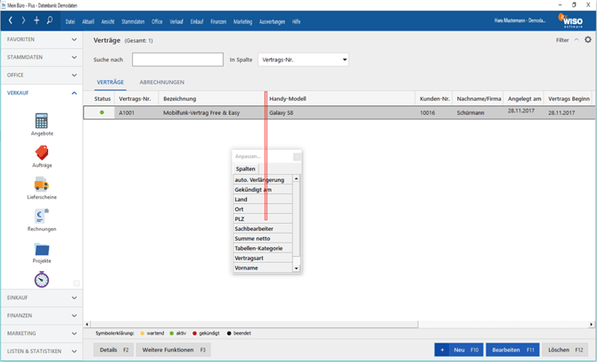 Um diesen Inhalt in der Übersicht der Verträge darzustellen, begeben Sie sich unter "Verkauf > Verträge" und klicken dann auf "Ansicht > Spalten definieren". Ein kleines Fenster "Anpassen…" öffnet sich. Ziehen Sie nun mit gedrückter linker Maustaste Ihr individuelles Feld oben in die Überschriftenzeile, beispielsweise neben das Feld "Bezeichnung". Erscheinen zwei kleine grüne Pfeile, lassen Sie die linke Maustaste einfach los. Das Feld befindet sich nun mit in der Übersicht der Verträge:
