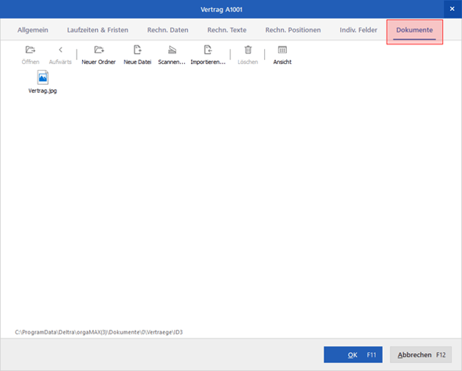 Im Register "Dokumente" können Sie beispielsweise eingescannte Schriftstücke ablegen: