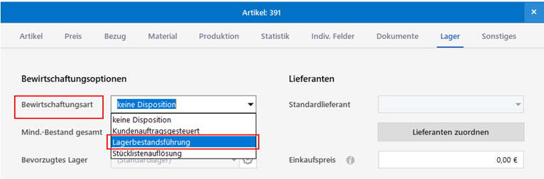 Damit ein Artikel im Bereich "Einkauf > Lagerbestände" angezeigt wird, ist es erforderlich, im Artikel die Bewirtschaftungsart "Lagerbestandsführung" anzugeben: