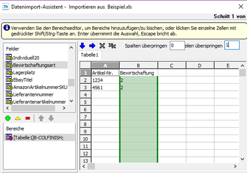 Sie haben zudem die Möglichkeit eines Ergänzungsimports. Hierfür benötigen Sie lediglich die Artikelnummer der bereits angelegten Artikel in den Stammdaten von WISO Mein Büro und die Bewirtschaftungsart. Über den Artikelimport-Assistent weisen Sie die Spalten wie folgt zu: