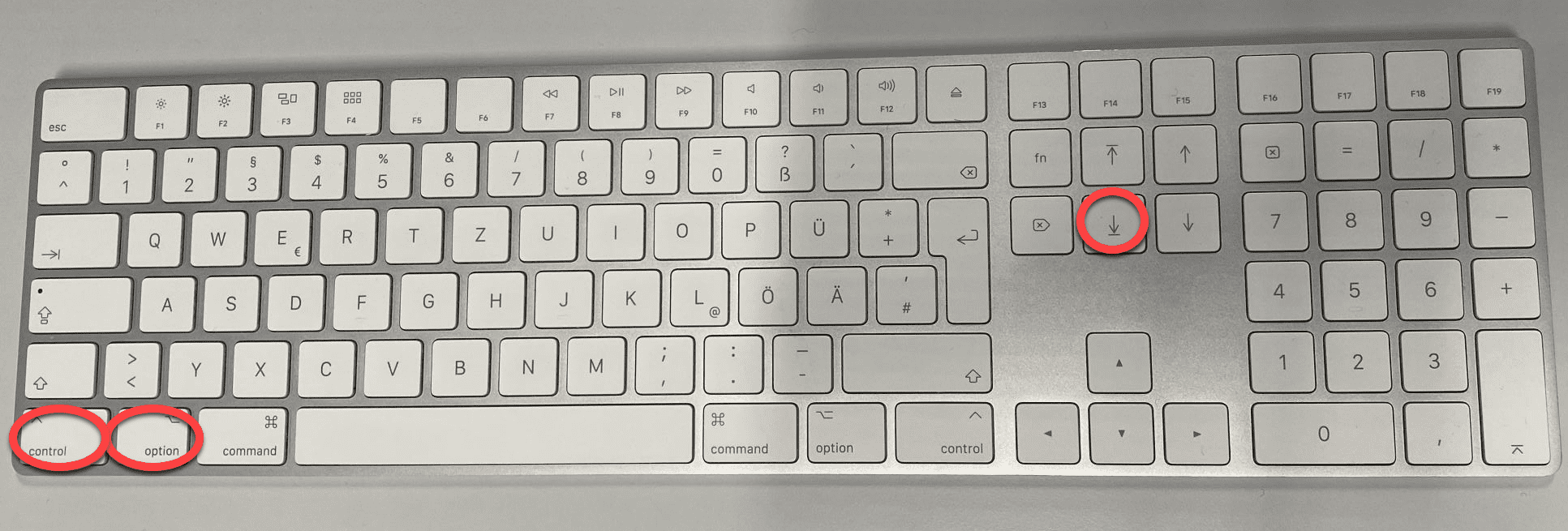 CONTROL+OPTION+ENDE (Falls es auf Ihrer Tastatur keine ENDE-Taste gibt, dann nehmen Sie bitte die Komma-Taste unten rechts im Nummernblock)