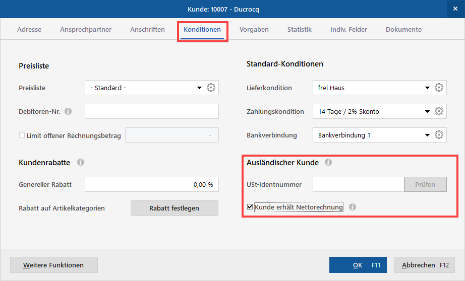 Haben Sie beispielsweise einen Auslandskunden in den Stammdaten, für den generell keine Mehrwertsteuer berechnet werden soll, öffnen Sie den entsprechenden Kunden in den Stammdaten, wechseln dort in die Registerkarte "Konditionen" und wählen dort "Dieser Kunde bekommt eine Netto-Rechnung".