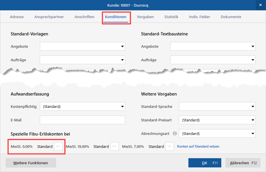 Sofern dieser Kunde immer nach denselben Vorgaben eine Rechnung gestellt bekommen soll, wechseln Sie in den Reiter "Vorgabewerte". Klicken Sie anschließend auf die drei Punkte neben "MwSt. 0 %: Standard".