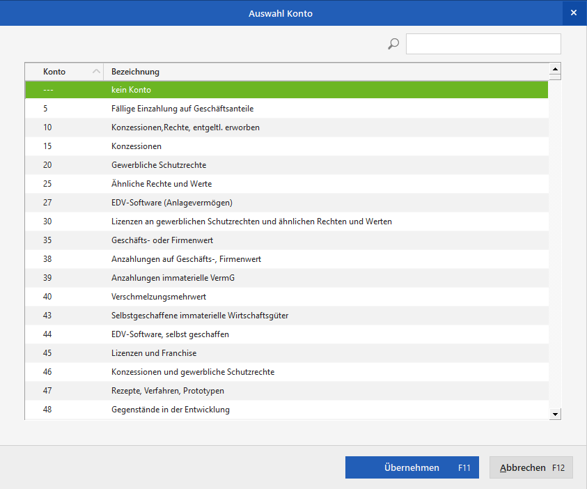 Sie erhalten einen entsprechenden Auszug aus Ihrem Kontenplan. Aus diesem wählen Sie das gewünschte Konto aus. Welcher Paragraph für Sie zutreffend ist, klären Sie bitte mit Ihrem Steuerberater oder dem zuständigen Finanzamt. Verlassen Sie die Fenster im Anschluss über "OK".