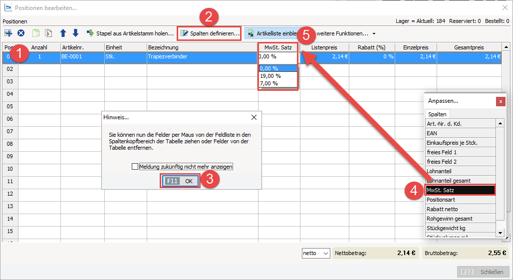 Ist die Spalte "MwSt. Satz" in der Tabellenübersicht nicht vorhanden, lässt sich diese über die Schaltfläche "Spalten definieren" integrieren. Orientieren Sie sich dazu an dem unten dargestellten Bildschirmfoto. Die Spalte "MwSt. Satz" ziehen Sie bei gedrückter linker Maustaste (Drag & Drop) an die gewünschte Stelle und lassen dann wieder die Maustaste los.