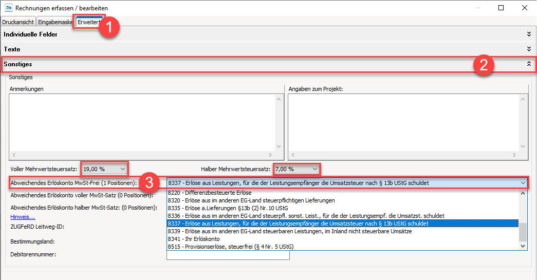 Anschließend wechseln Sie innerhalb der Rechnung bitte oben links auf "Erweitert". Im unteren Bereich sehen Sie "Sonstiges". Wählen Sie unter "Abweichendes Erlöskonto MwSt.-Frei (XX Positionen):" das gewünschte abweichende Erlöskonto.