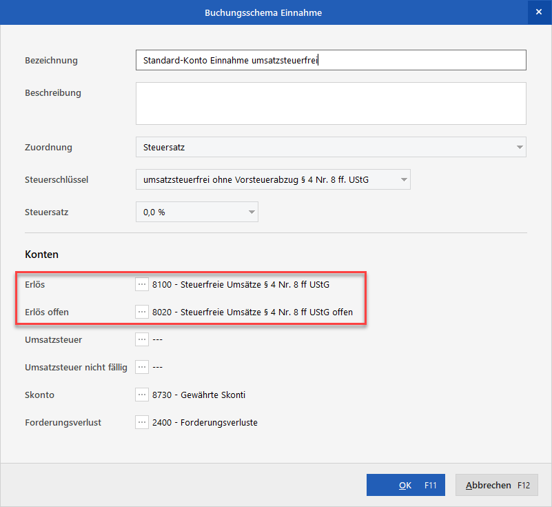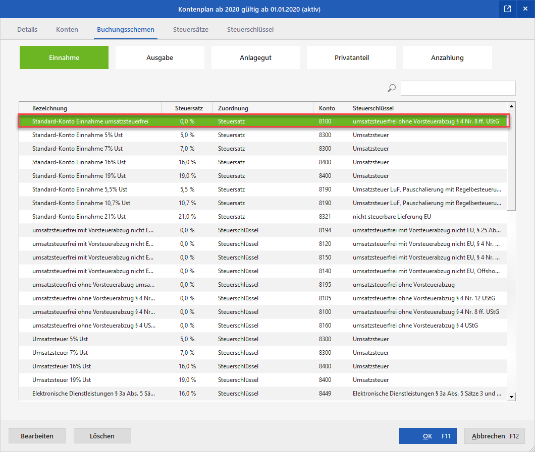 Wählen Sie das Schema "Standard-Konto Einnahme umsatzsteuerfrei" aus und bestätigen Sie "Bearbeiten".