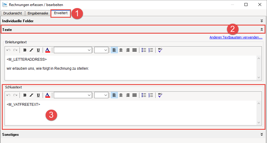 Erscheint der Text zur Mehrwertsteuerbefreiung im Anschluss nicht auf der Druckansicht, fehlt die entsprechende Variable im Schlusstext. Wechseln Sie erneut in den Bereich "Erweitert" und wählen Sie dann "Texte". Tragen Sie unter "Schlusstext" die Variable "<M_VATFREETEXT>" ein.