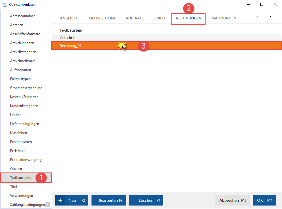 Um diese Variable auf allen künftigen Rechnungen ausweisen zu lassen, wechseln Sie bitte über die Menüleiste in den Bereich "Stammdaten > Kleinstammdaten". Klicken Sie anschließend auf "Textbausteine", dann auf "Rechnungen" und dann per Doppelklick auf "Rechnung_01".