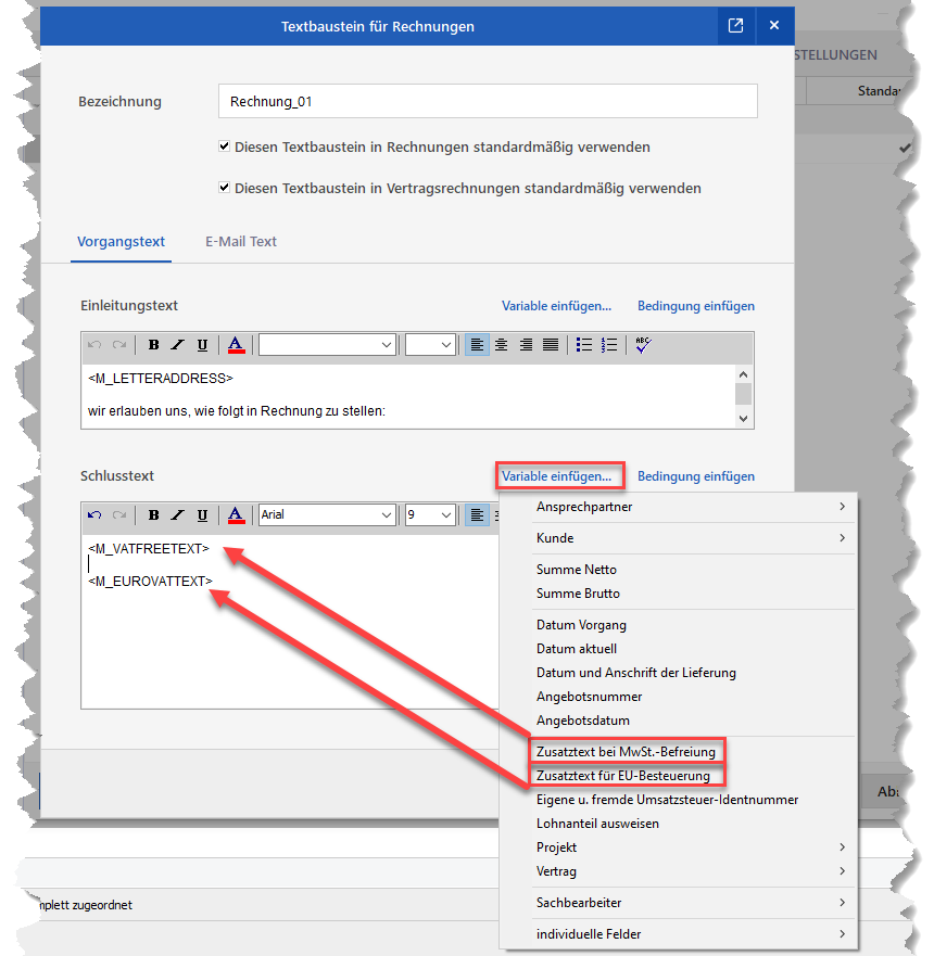 Auf allen steuerfreien Rechnungen ist der Text zur Mehrwertsteuerbefreiung auszuweisen. Standardmäßig ist in den Textbausteinen eine entsprechende Variable hinterlegt, die diesen Text in der Rechnung automatisch ausweist. Sofern dieser nicht erscheint, wechseln Sie Kapitel 3. Text zur Mehrwertsteuerbefreiung erscheint nicht.