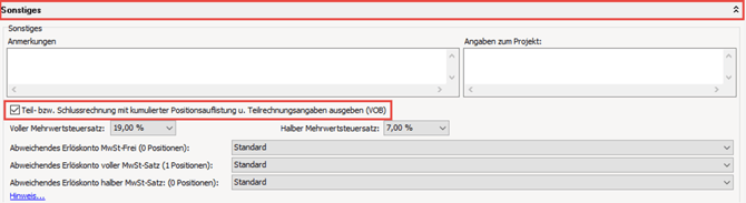 Sie haben ebenfalls die Möglichkeit „kumulierte Positionsauflistung (VOB)“ vorgangsbezogen zu aktivieren oder deaktivieren. Hierzu wechseln Sie in dem gewünschten Vorgang oben links auf „Erweitert“ und wechseln weiter unten auf den Bereich „Sonstiges“. Setzen Sie hier entsprechend den Haken bei „Teil- bzw. Schlussrechnung mit kumulierter Positionsauflistung u. Teilrechnungsangaben ausgeben (VOB)“.