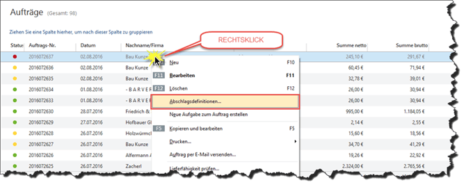 Sie finden sich in der Übersicht der Aufträge wieder, hier klicken Sie den betroffenen Auftrag mit der rechten Maustaste an und wählen über das Kontextmenü den Punkt „Abschlagsdefinitionen…“.