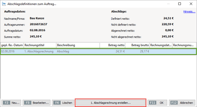 Nachdem Sie Schritt 4 mit „OK“ bestätigt haben, sehen Sie unten stehenden Dialog. Hier klicken Sie zum Erstellen der 1. Abschlagsrechnung bitte auf die entsprechende Schaltfläche.