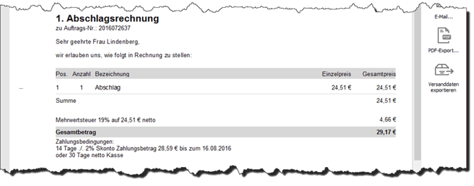 Nachdem Sie auf „1. Abschlagsrechnung erstellen…“ geklickt haben, öffnet sich diese. Sie haben wie gewohnt die Möglichkeit die Rechnung zu drucken, exportieren oder per E-Mail zu versenden.