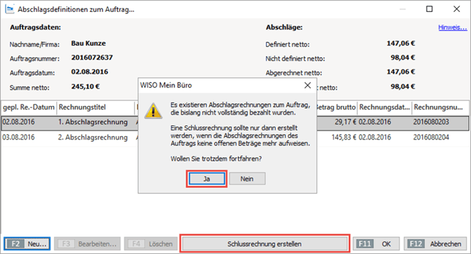 Gegebenenfalls erhalten Sie, wie in dem Beispiel zu sehen, eine Meldung, dass noch offene Abschlagsrechnungen vorhanden sind. Sofern Sie dennoch die Schlussrechnung erstellen möchten, klicken Sie auf „Ja“.