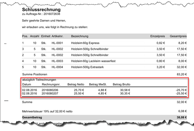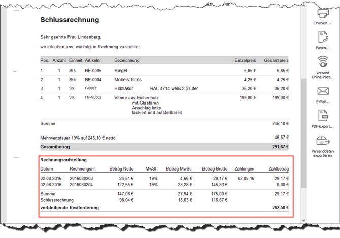Die Schlussrechnung stellt Ihnen anschließend die gesamten Artikel erneut dar und führt zudem die bereits gestellten Teilrechnungen auf.