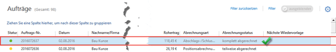 Nachdem Sie die Schlussrechnung verlassen haben, schließen Sie die Abschlagsdefinitionen und erhalten in der Übersicht der Aufträge Ihren Auftrag als „komplett abgerechnet“ angezeigt.
