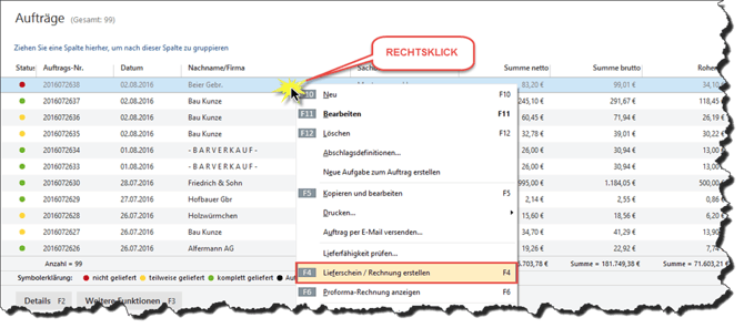 Klicken Sie den Auftrag mit der rechten Maustaste an und wählen „F4 Lieferschein- / Rechnung erstellen“.