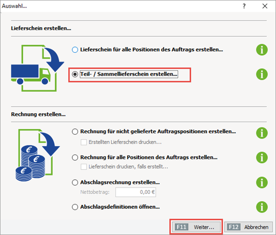 Im darauffolgenden Dialog wählen Sie bitte „Teil- / Sammellieferschein erstellen…“. Klicken Sie anschließend auf „Weiter…“.
