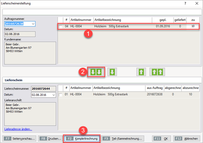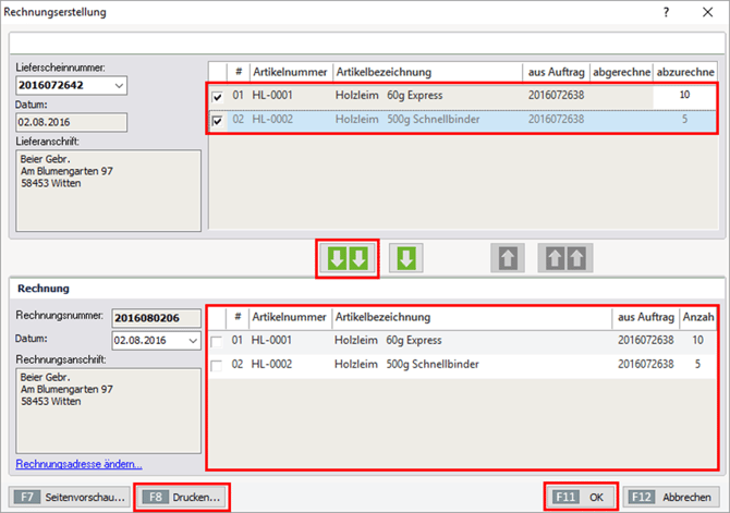 Durch einen Klick auf den einfachen Pfeil, werden die oben ausgewählten Artikel in entsprechender Menge nach unten verschoben. (Der untenstehende Dialog stellt beides in einem dar.)