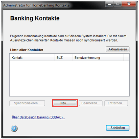 Bevor Sie den Banking-Kontakt anlegen, stellen Sie bitte sicher, dass die Banking-Schnittstelle auch auf dem neusten Stand ist. Eine Anleitung zum notwendigen Vorgehen finden Sie hier.