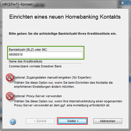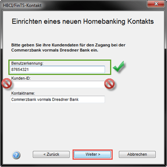 Geben Sie im nächsten Fenster Ihre Zugangsdaten ein. Bitte geben Sie im Falle der Commerzbank ausschließlich Ihre "Benutzerkennung" ein. Klicken Sie im Anschluss auf "Weiter".
