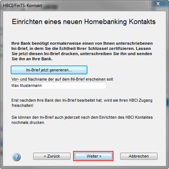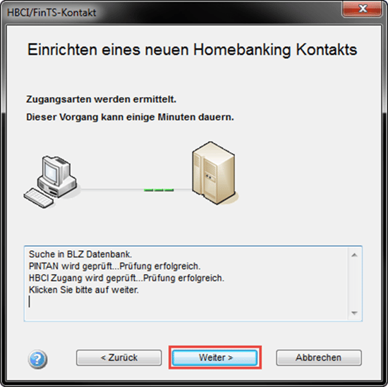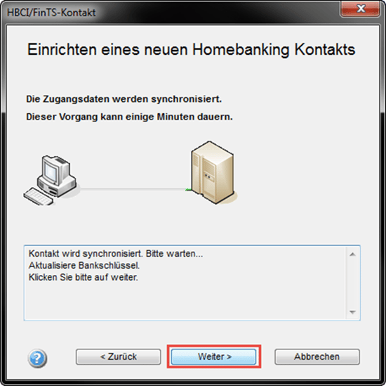 Im darauffolgenden Schritt wird der Kontakt erneut Synchronisiert und die Bankschlüssel aktualisiert. Klicken Sie anschließend bitte auf "Weiter".