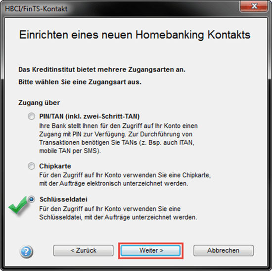 Fahren Sie einfach mit "Weiter fort und wählen im nächsten Fenster das entsprechende Sicherheitsverfahren. In diesem Fall wählen Sie bitte Schlüsseldatei aus.