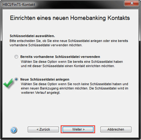 Im folgenden Fenster wählen Sie bitte den Punkt "Neue Schlüsseldatei anlegen" sofern Sie noch über keine Schlüsseldatei verfügen. Klicken Sie im Anschluss erneut auf "Weiter".