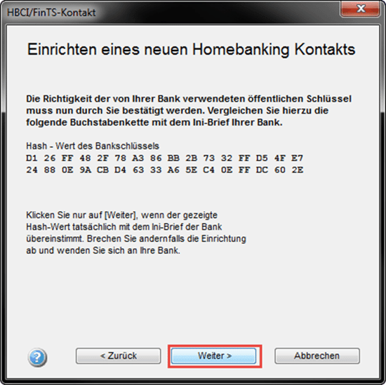 Sie erhalten nun den von Ihrer Bank verwendeten öffentlichen Schlüssel angezeigt. Vergleichen Sie diesen bitte mit Ihren Unterlagen. Klicken Sie daraufhin auf "Weiter".