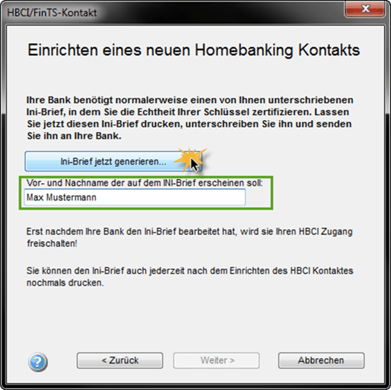 In oben stehendem Fenster tragen Sie bitte Ihren Vor- und Nachnamen ein, damit dieser auf dem INI-Brief erscheint. Klicken Sie anschließend auf "Ini-Brief jetzt generieren…". Nach dem Betätigen der Schaltfläche, öffnet sich automatisch Ihr Standard-Internetbrowser.