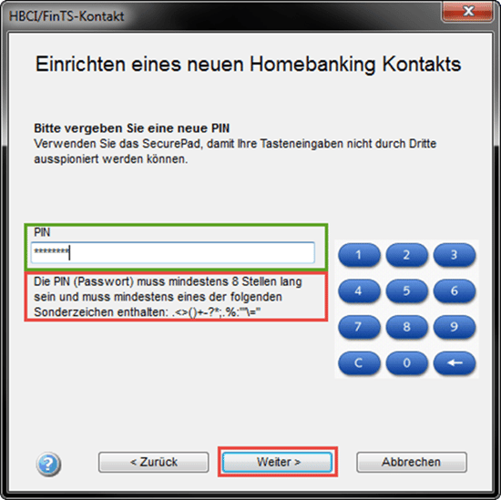 Anschließend landen Sie in folgendem Fenster. Hier vergeben Sie bitte eine selbstgewählte 8-stellige PIN. Beachten Sie bitte unbedingt die PIN (Passwort) Vorgaben. Klicken Sie im Anschluss auf "Weiter".