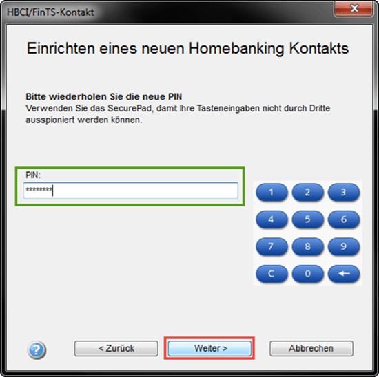 Im folgenden Fenster bestätigen Sie bitte Ihre selbstgewählte PIN durch die erneute Eingabe und fahren mit "Weiter" fort.