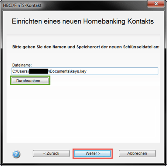 Es folgt nun ein Dialog, in dem Sie den Speicherort Ihrer Schlüsseldatei frei definieren können. Klicken Sie auf "Durchsuchen" und wählen darüber den gewünschten Speicherort aus und bestätigen mit "Speichern". Bestätigen Sie dieses Fenster bitte mit "Weiter".