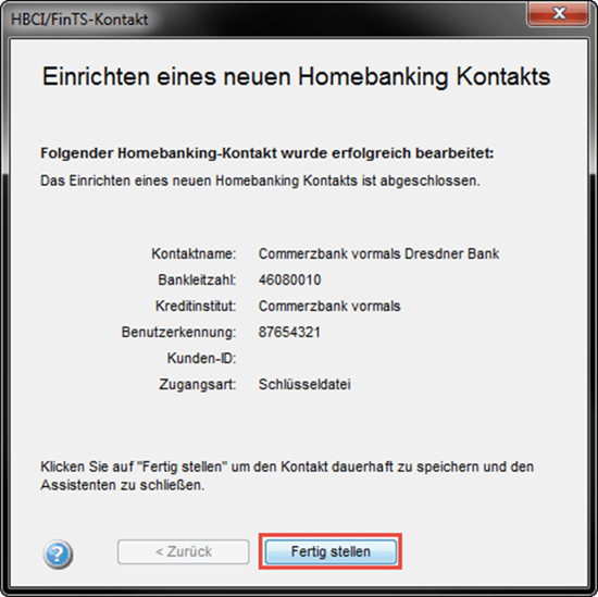 Sie verfügen nun über einen einwandfrei eingerichteten Banking Kontakt. Um diesen einer programminternen Bankverbindung zuzuordnen, folgen Sie bitte dieser Anleitung ab Seite 7.