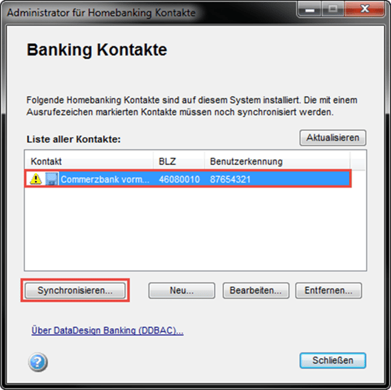 Nachdem Sie die Bestätigung der Bank zur Freischaltung der Signatur vorliegen haben, wechseln Sie in den Programmbereich "Stammdaten > Meine Firma > Bankverbindungen" und öffnen die "Banking-Kontakte". Markieren Sie den Kontakt zu der betreffenden Bank in der Übersicht und "Synchronisieren…" Sie diesen. Verlassen Sie nach erfolgreicher Synchronisation die Übersicht mit "Schließen". Bei einem synchronisierten Kontakt ist das Ausrufezeichen vor dem Kontakt entfernt.