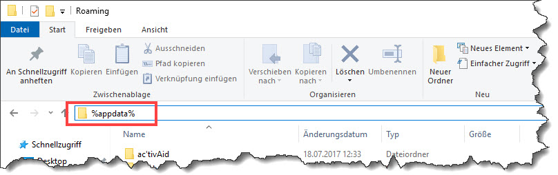 - Geben Sie in der "Adresszeile" bitte "%appdata%" (ohne Anführungszeichen) ein und bestätigen die Eingabe mit der ENTER-Taste.