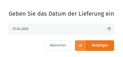 Nach Klick auf den Button "Als geliefert markieren" trägst du das Datum der Lieferung ein und klickst auf den Button "Bestätigen".