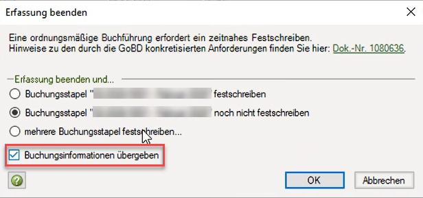 Nachdem du über DATEV Rechnungswesen die Belege abgerufen und die Buchungen bearbeitet hast, kannst du die geänderten Daten an DATEV Belege online übermitteln. Setze dafür das Häkchen "Buchungsinformationen übergeben".