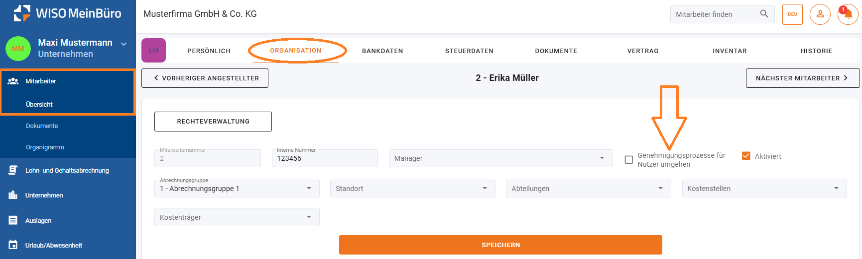 - Es kann künftig festgelegt werden, dass ein Mitarbeiter nicht von einem Genehmigungsprozess betroffen ist, beispielsweise ein Geschäftsführer. Die entsprechende Einstellung kann unter Mitarbeiter > Organisation vorgenommen werden.