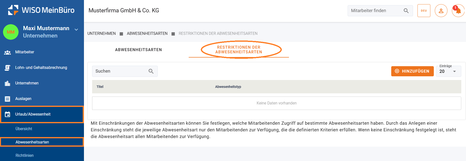 Mit Einschränkungen der Abwesenheitsarten können Sie festlegen, welche Mitarbeitenden Zugriff auf bestimmte Abwesenheitsarten haben. Durch das Anlegen einer Einschränkung steht die jeweilige Abwesenheitsart nur den Mitarbeitenden zur Verfügung, die die definierten Kriterien erfüllen. Wenn keine Einschränkung festgelegt ist, steht die Abwesenheitsart allen Mitarbeitenden zur Verfügung.
