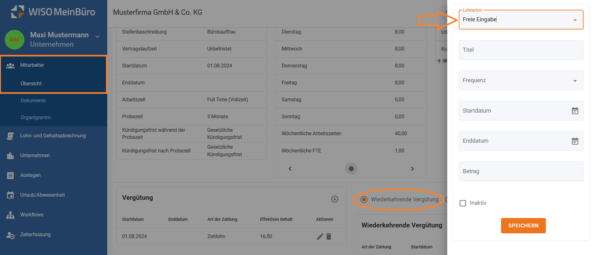 - Im Reiter Vertrag > wiederkehrende Vergütung können nun freie Einträge im Bereich Lohnarten getätigt werden