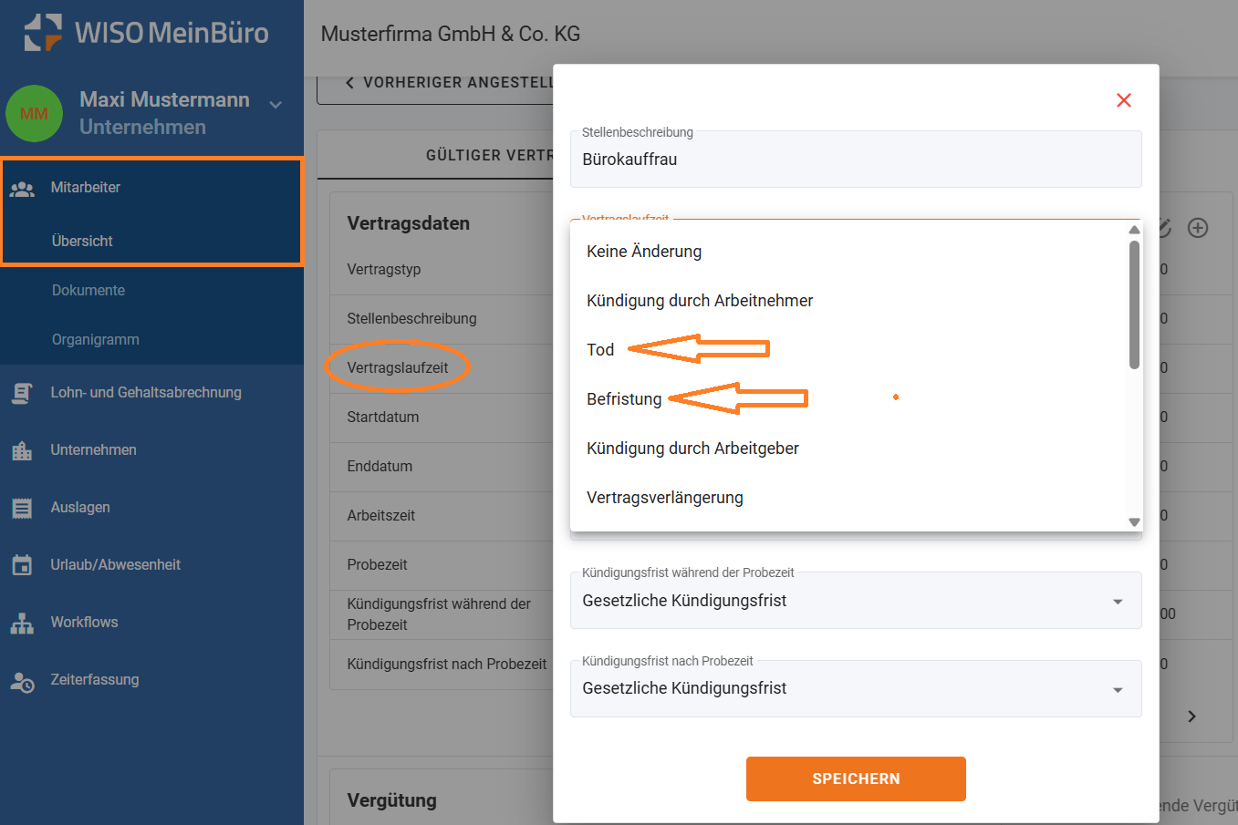 Wird Tod oder Befristung gewählt, muss zwingend ein Enddatum eingetragen werden.