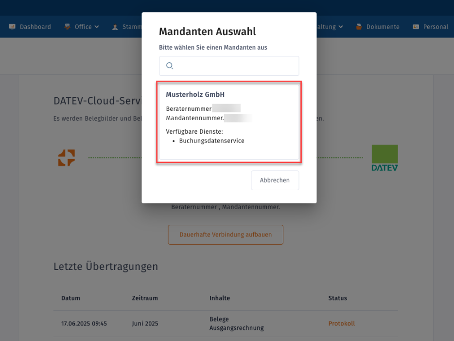 Du erhältst anschließend das Fenster zur Mandanten-Auswahl. Wähle den Mandanten aus, um die Verbindung herzustellen: